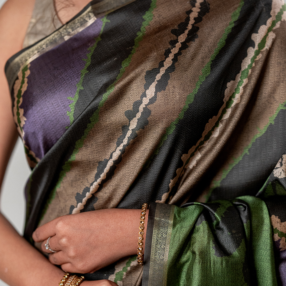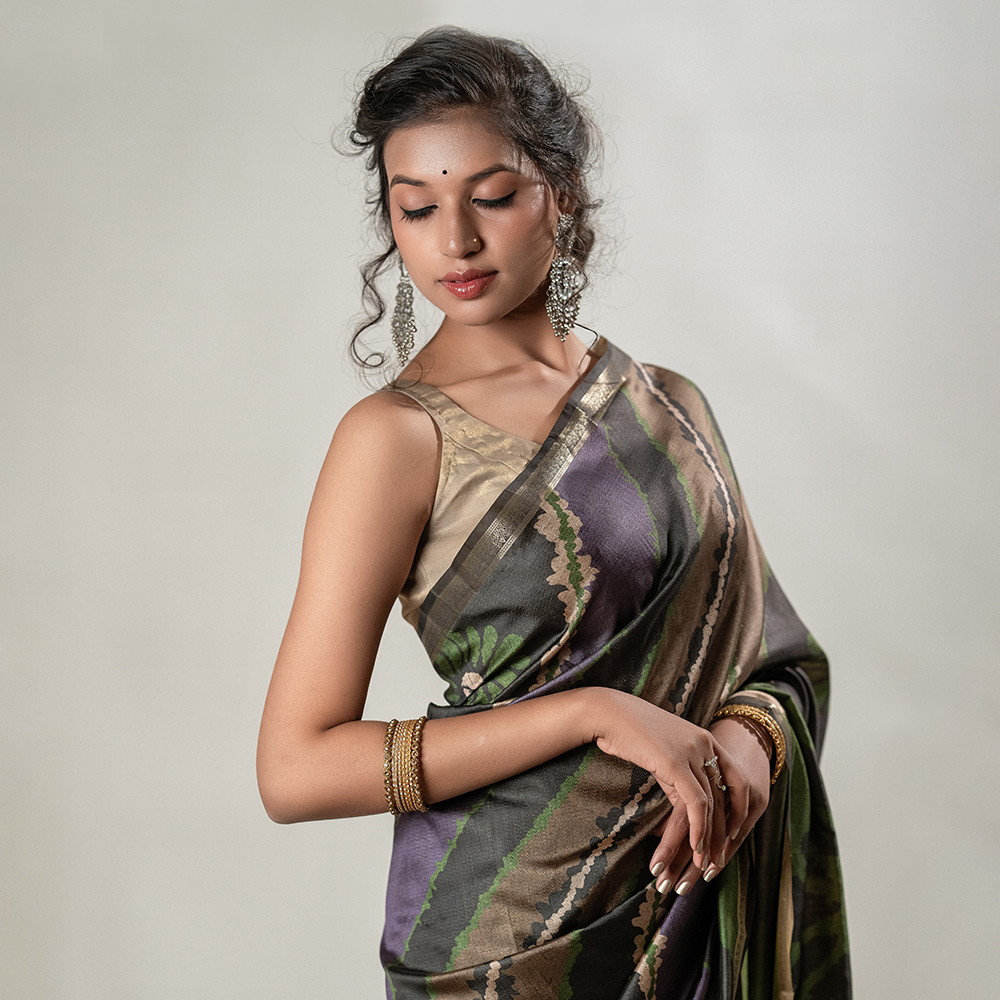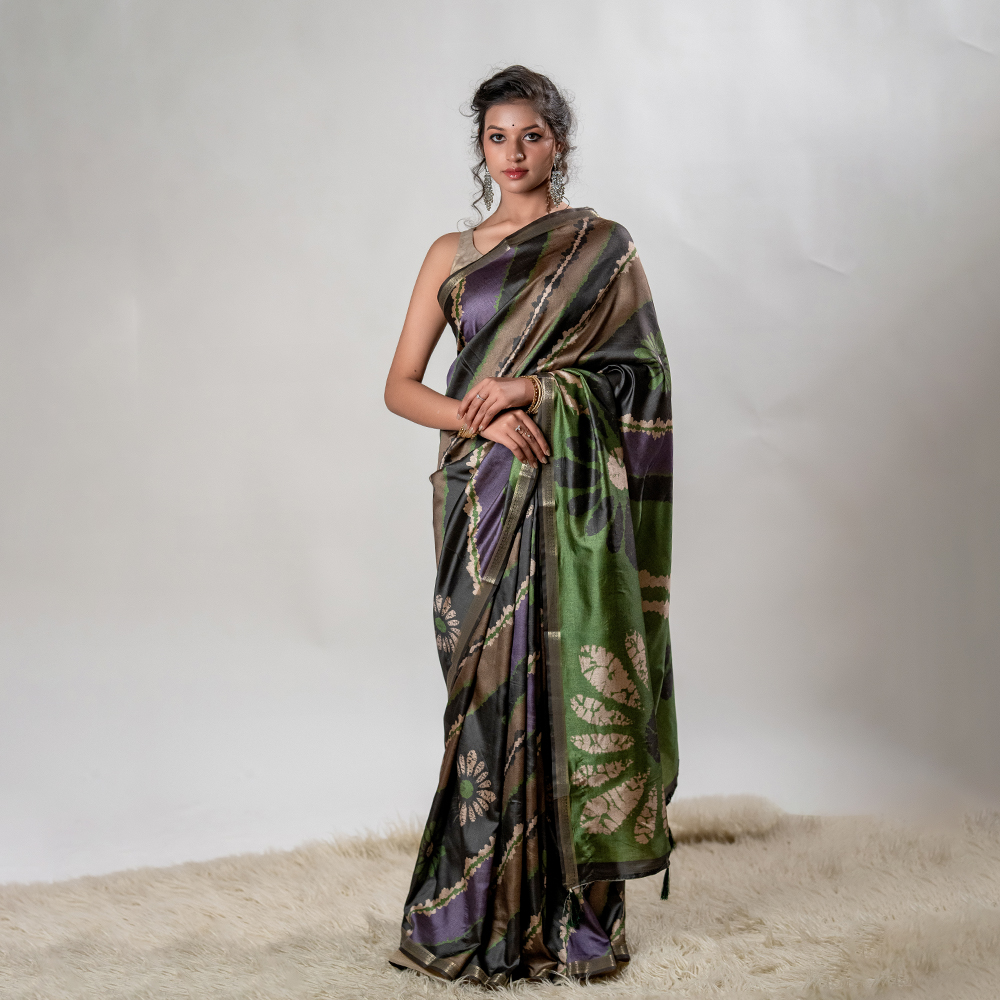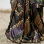 | Description | Embrace the mystery of the night with the Dark Aurelia. This exquisite soft silk saree features a deep charcoal canvas accented by hand-drawn floral medallions and earthy diagonal stripes. It’s designed for the woman who loves to blend traditional artistry with a bold, contemporary edge. |